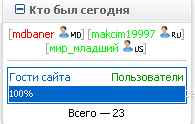 Интересный информер Кто нас сегодня посетил не такая уж новинка, но не такой как были предыдущие виды, в настройках все так же само , только изменено оформление, теперь он в другом исполнении, выводит информацию о пользователях которые посетили саит за текущий день, так же показывается рядом с ником пользователя его пол в графической картинке женский пол пользователямужской пол пользователя, и еще показывает его страну маленьким шрифтом, все это видно скрине. в установке код очень прост и его так же можно настроить в цветах и высоте шрифта. Если вы хотите как на скрине видеть и у себя цветами ники пользователей то эти все настройки делаются в таблице стилей по отношению ко всем группам пользователей.
